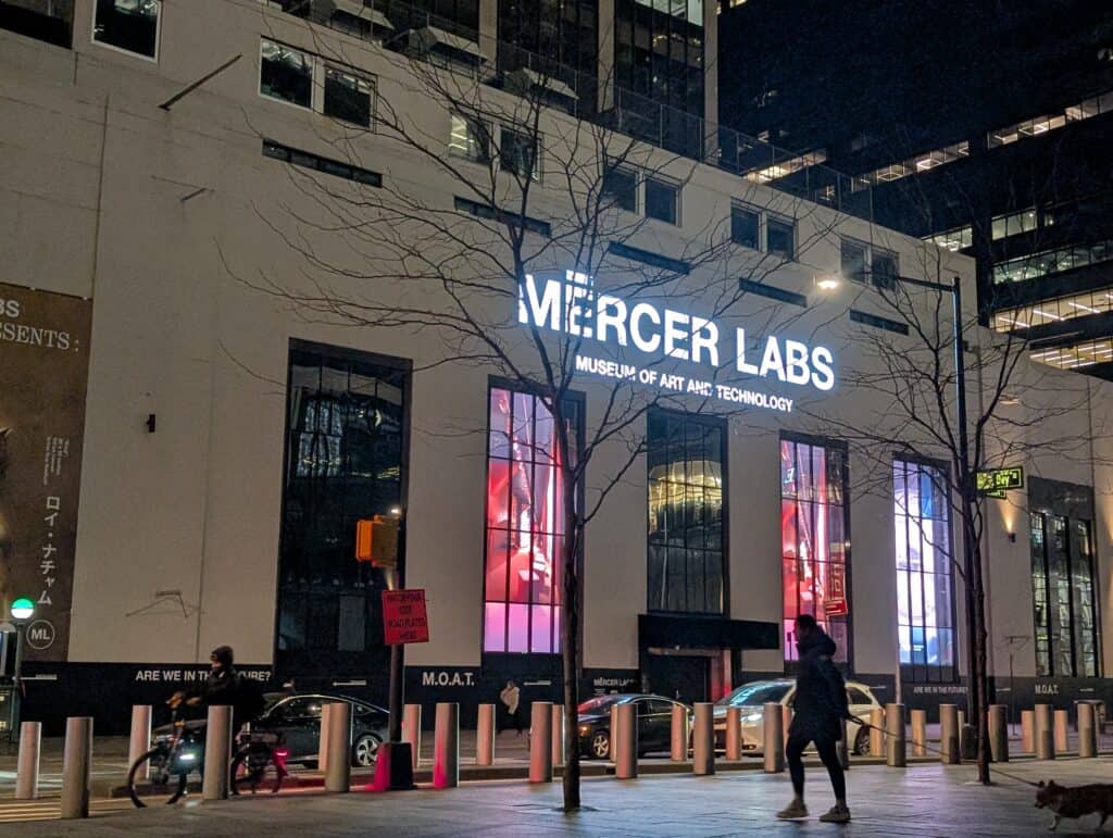 Mercer labs é um prato cheio para quem ama cultura, tecnologia e inovação. Próximo ao coração comercial de Nova York, o prédio chama atenção por suas linhas cleans e grandes janelas com LED passando vídeos coloridos.