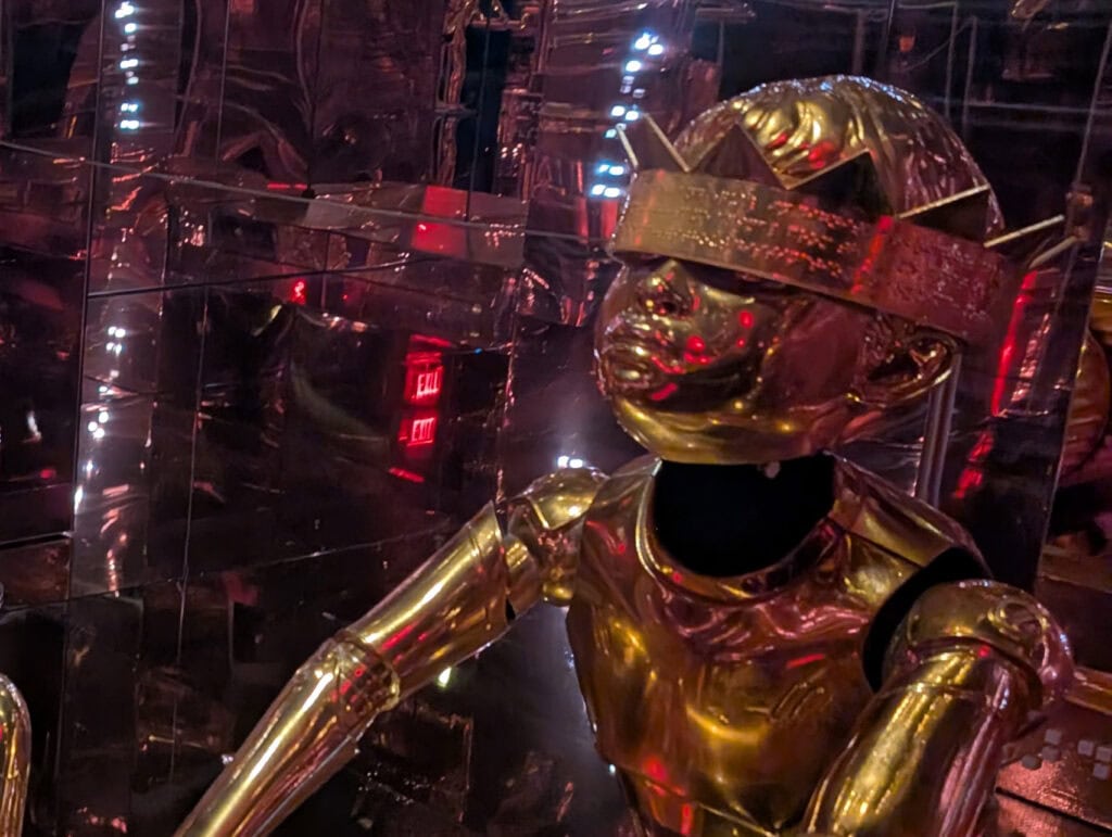 Talvez você repare que alguns elementos que se repetem pelo espaço, escritas em braile e um menino com uma coroa dourada cobrindo os olhos. Itens esses que são assinatura do criador criativo, Roy Nachun do Mercer Labs, ele diz que “A Coroa serve como símbolo de humildade e igualdade. O Braille, um meio de comunicação através da poesia e da linguagem, é inclusivo e uma homenagem às pessoas com deficiência visual, contribuindo para a conscientização sobre o tema.”