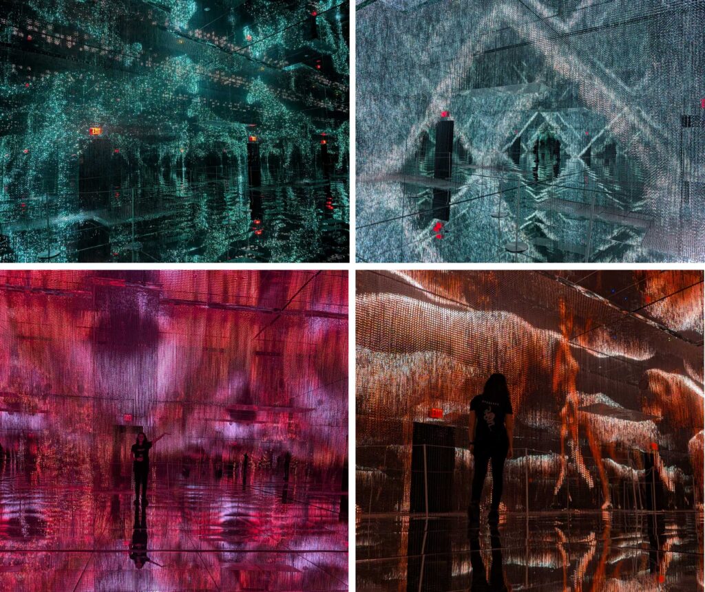 Posso falar sem sombra de dúvidas que a instalação THE DRAGON foi a que mais mexeu comigo. Na sala espelhada com som ambiente, e um grandioso volume de linhas com leds incrivelmente sincronizados e programados, dão vida a cachoeiras, manadas de elefantes, cavalos correndo ao vento, grafismos e outros efeitos. Tive a sorte de estar sozinha na sala e poder curtir tranquilamente. Teria ficado mais tempo na sala, mas outras pessoas chegaram.